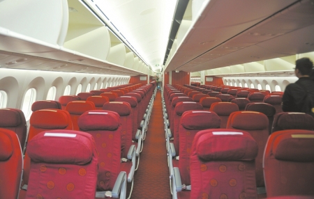 记者了解到,首航客机总共有289个座位,经济舱有259个,客舱布局宽敞舒适,30个公务舱配备180度平躺按摩座椅,BOSE降噪耳机及宝格丽的洗漱包,全舱配备了Mini Pad的娱乐点播系统,经济舱9英寸的屏幕,还有110部电影、90集电视短片、50张音乐专辑和30款游戏等,以方便旅客在飞机上打发无聊的时光。
