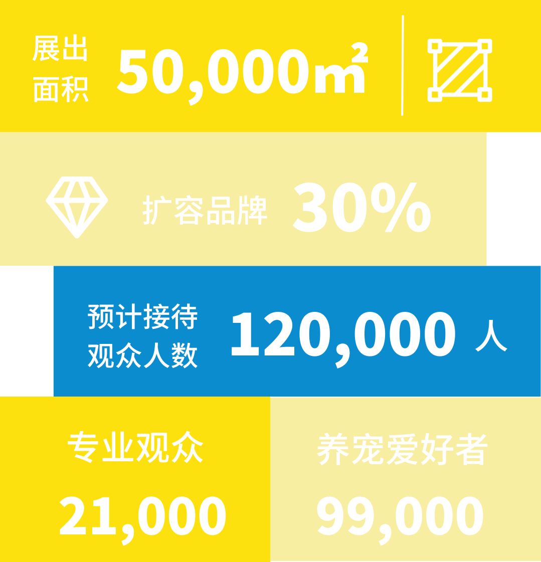 本届展会我们将优化客户逛展效能,方便观众更合理便捷的规划观展路线。我们将规划四个馆的布局,分割成宠物品牌综合馆、宠物新生活/大健康医疗馆、进口品牌/食品馆、国潮新势力食品馆、活体专区;方便观众更准确的找到自己想看的品牌,也让品牌接待更为精准的客户群体。